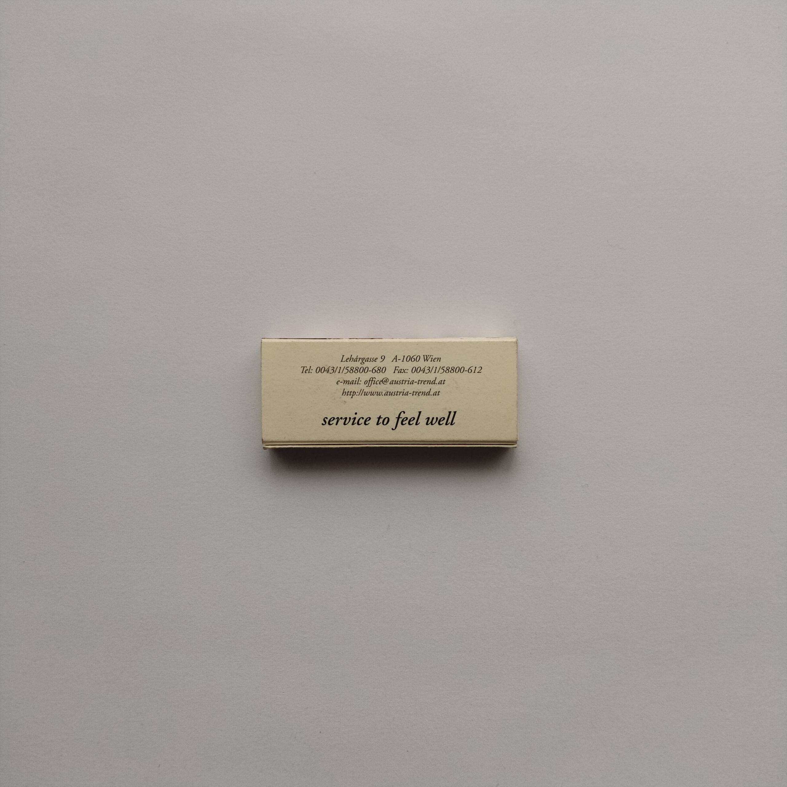 Category :Hotel AdvertisingCountry :AustriaType :Cardboard matchboxCondition :Very goodRarity :⭐⭐⭐Description :Promotional matchbox for Austria Trend Hotels & Resorts, Vienna. Reverse lists address on Lehrgasse with the slogan “service to feel well.”Share