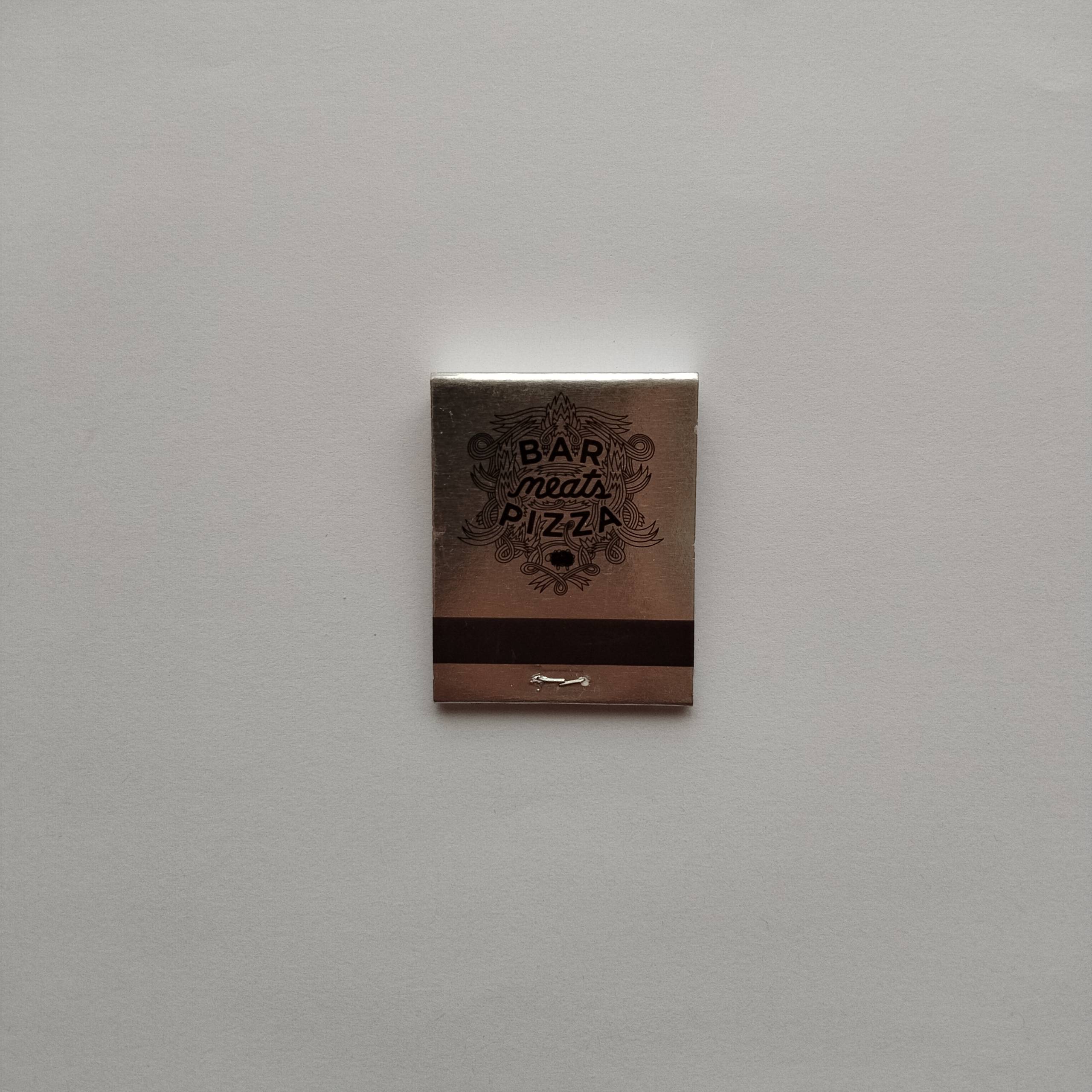 Category :Restaurant / Pizzeria PromotionalCountry :USAType :Cardboard, metallic-effect promotional matchboxCondition :GoodRarity :⭐⭐⭐⭐☆Description :Copper-toned matchbox featuring ornate “Bar Meat Pizza” typography and decorative emblemShareTwitter-xFacebookShare-emailCopy URL to clipboardChange Matchbox