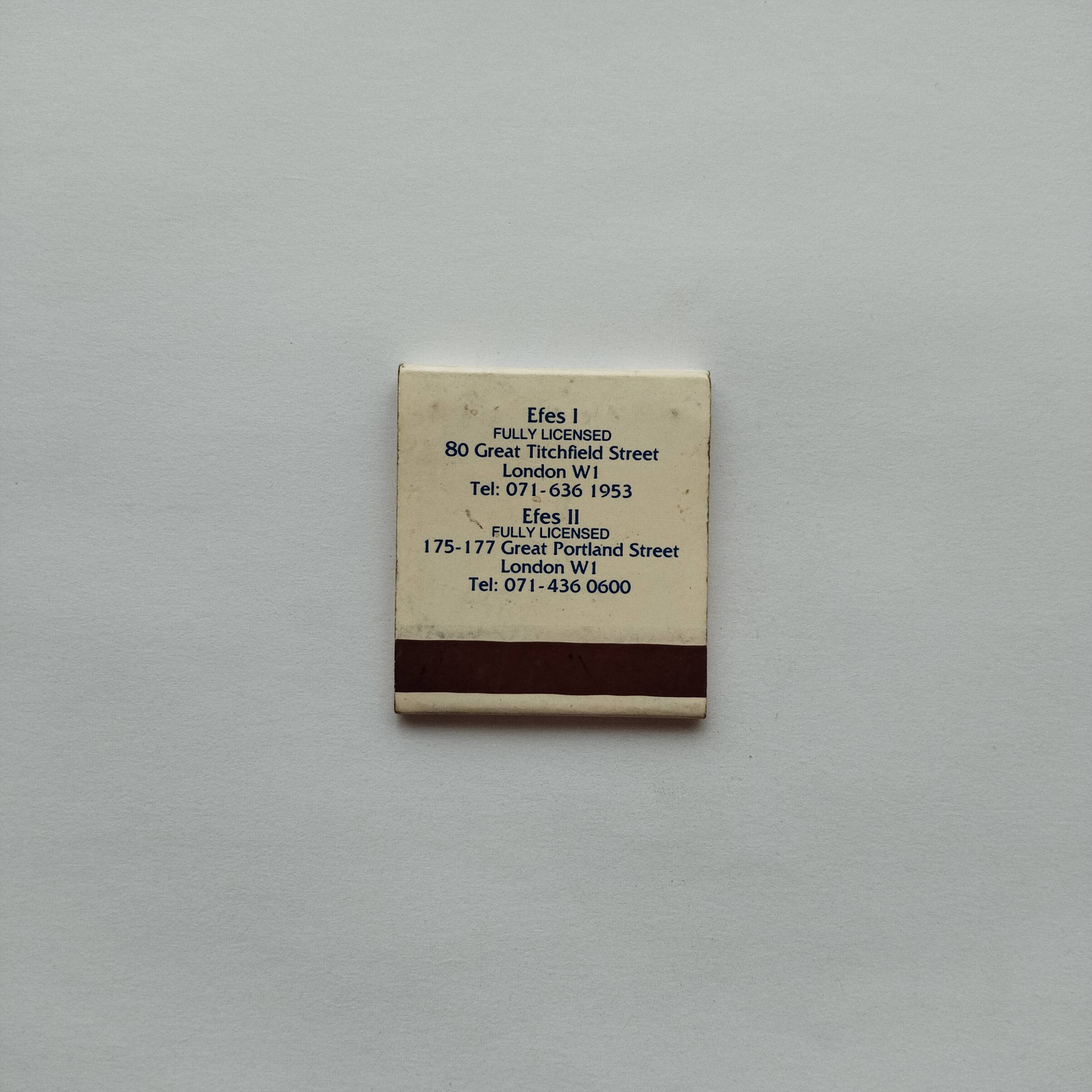 Category :Restaurant / AdvertisingCountry :United KingdomType :MatchbookCondition :GoodRarity :⭐⭐⭐Description :Back side of Efes Restaurants matchbook listing two London locations with contact details, clean and functional design.ShareTwitter-xFacebookShare-emailCopy URL to clipboardChange Matchbox