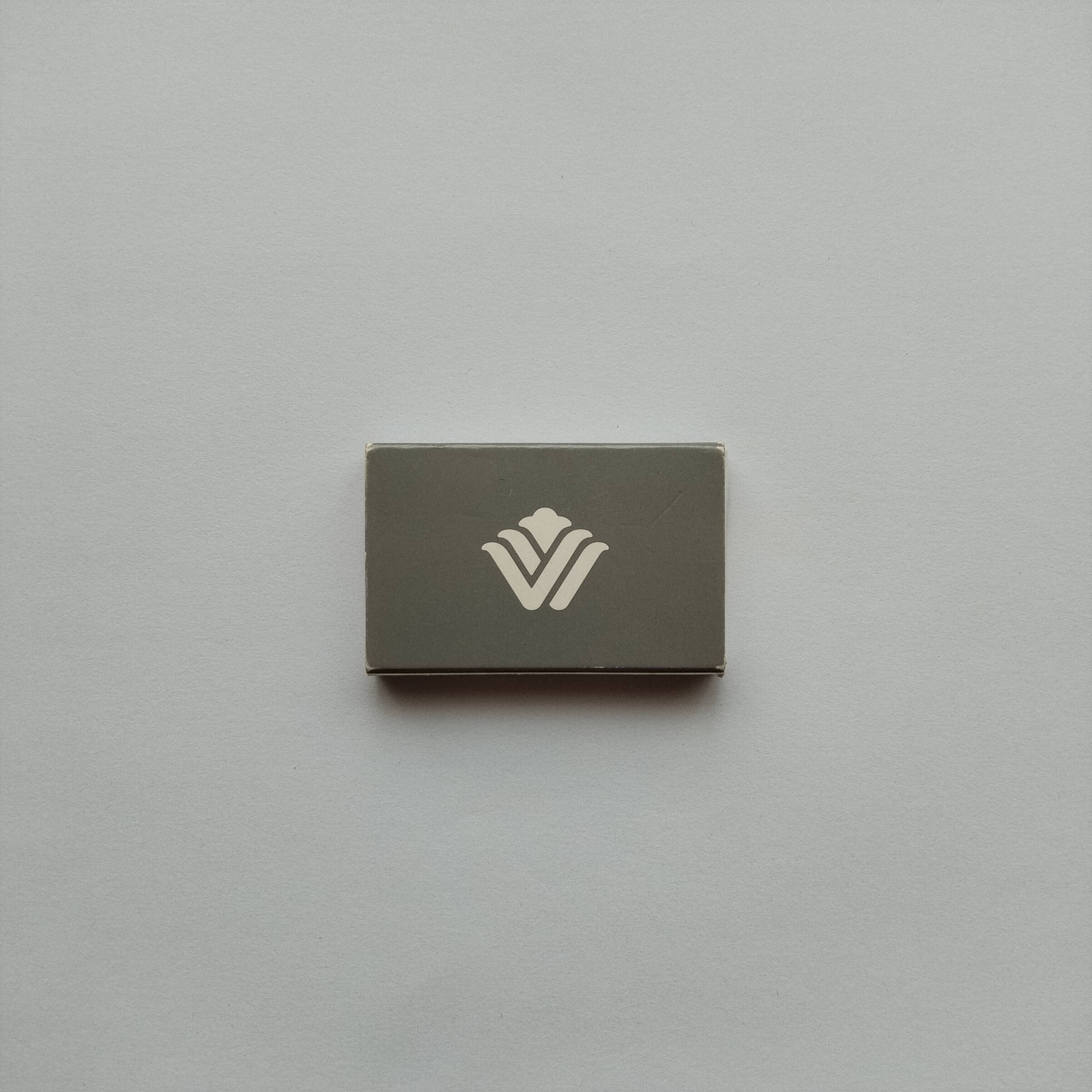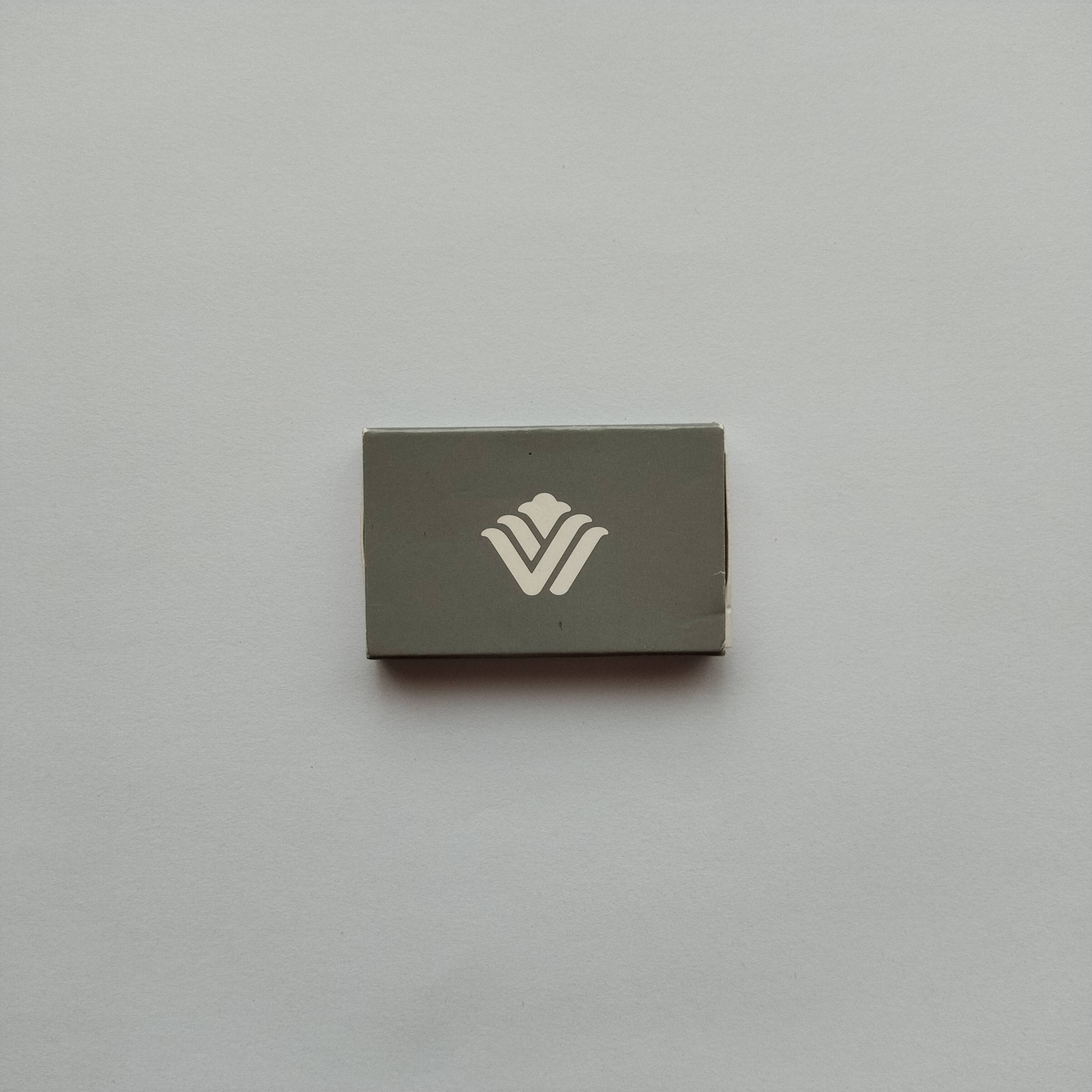 Category :Hotel PromotionalCountry :InternationalType :Cardboard matchboxCondition :GoodRarity :⭐⭐☆☆☆Description :Grey minimalist hotel matchbox featuring white stylized “V” logo on both sides. Clean modern branding design.ShareTwitter-xFacebookShare-emailCopy URL to clipboardChange Matchbox