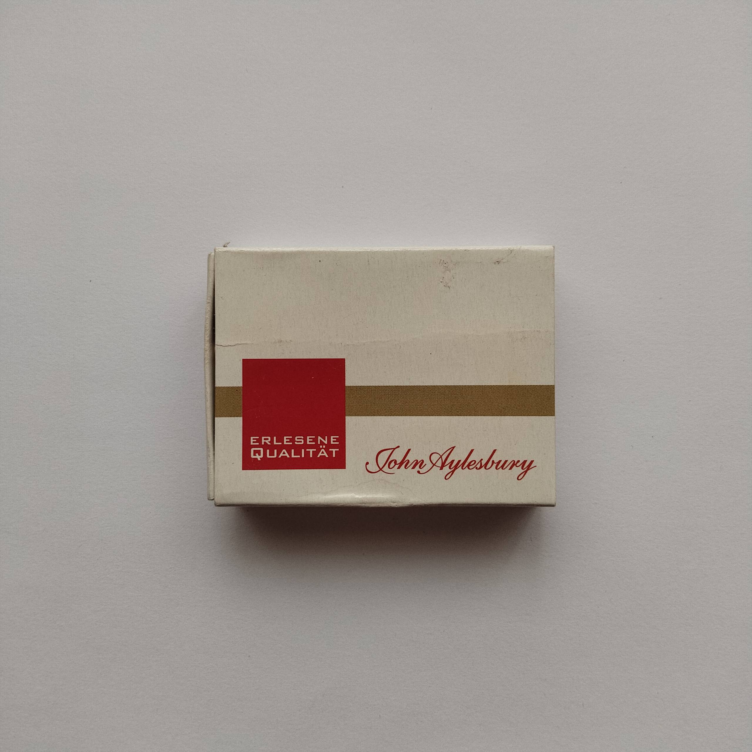 Category :Tobacco Retail / PromotionalCountry :GermanyType :Cardboard matchboxCondition :Good (minor edge wear, light creasing)Rarity :⭐⭐⭐☆☆Description :“John Aylesbury” tobacco retail promotional matchbox marked “Erlesene Qualität.” Clean cream-and-gold branding with classic European tobacconist typography.Share