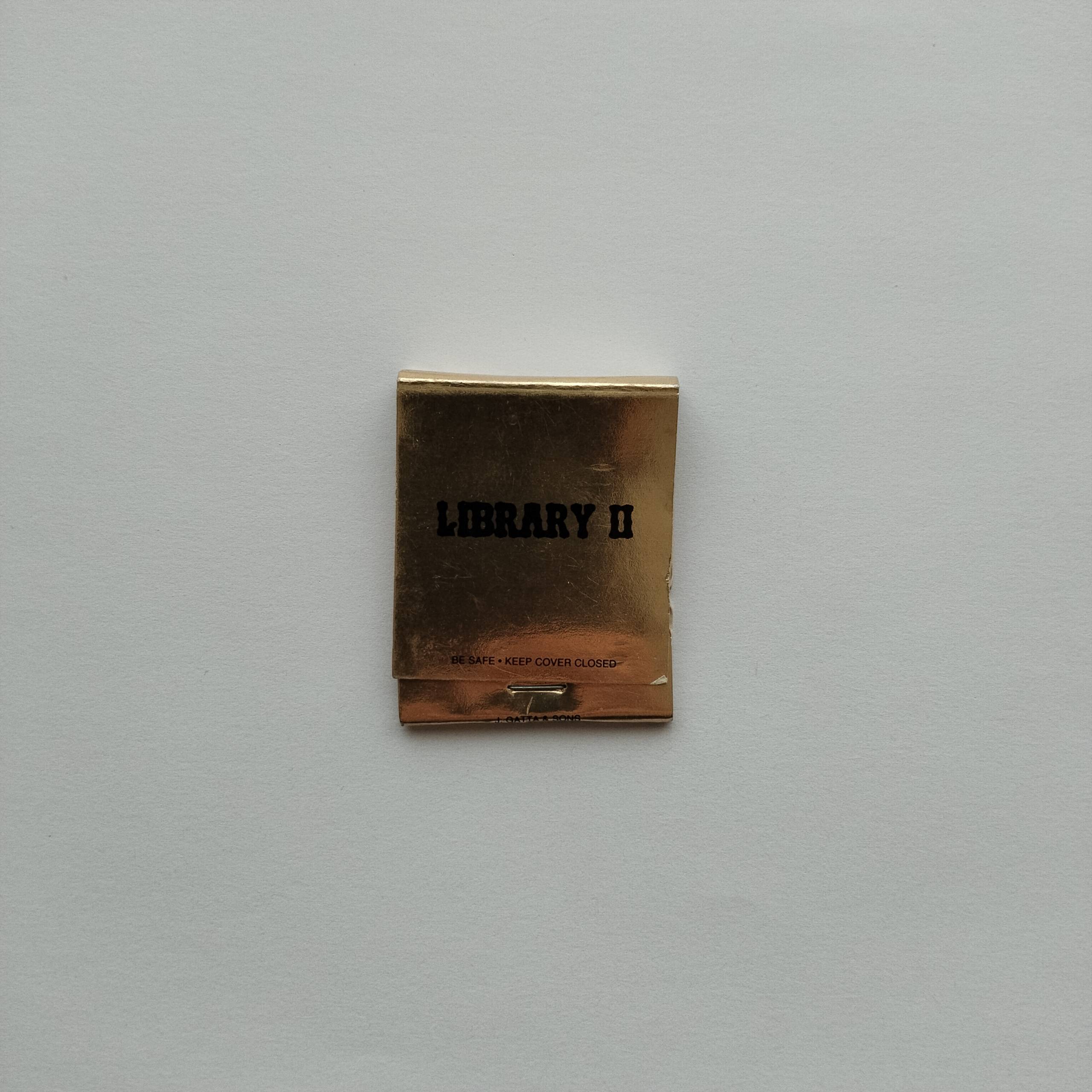 Category :AdvertisingCountry :USAType :MatchbookCondition :Fair (visible wear)Rarity :⭐⭐⭐⭐Description :Metallic gold “Library II” matchbook with bold black typography and vintage styling.ShareTwitter-xFacebookShare-emailCopy URL to clipboardChange Matchbox