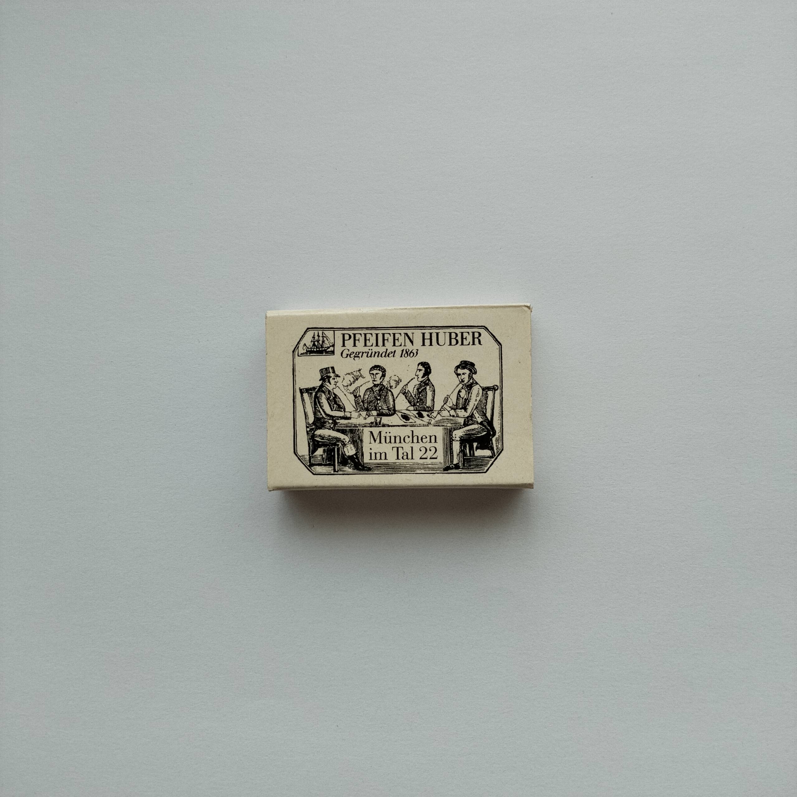 Category :PromotionalCountry :GermanyType :Cardboard matchboxCondition :Very GoodRarity :⭐⭐⭐⭐☆Description :Pfeifen Huber Munich promotional matchbox featuring vintage illustration of men smoking pipes. Classic German tobacco shop branding with “Gegründet 1863” and detailed period artwork, appealing to collectors.Share