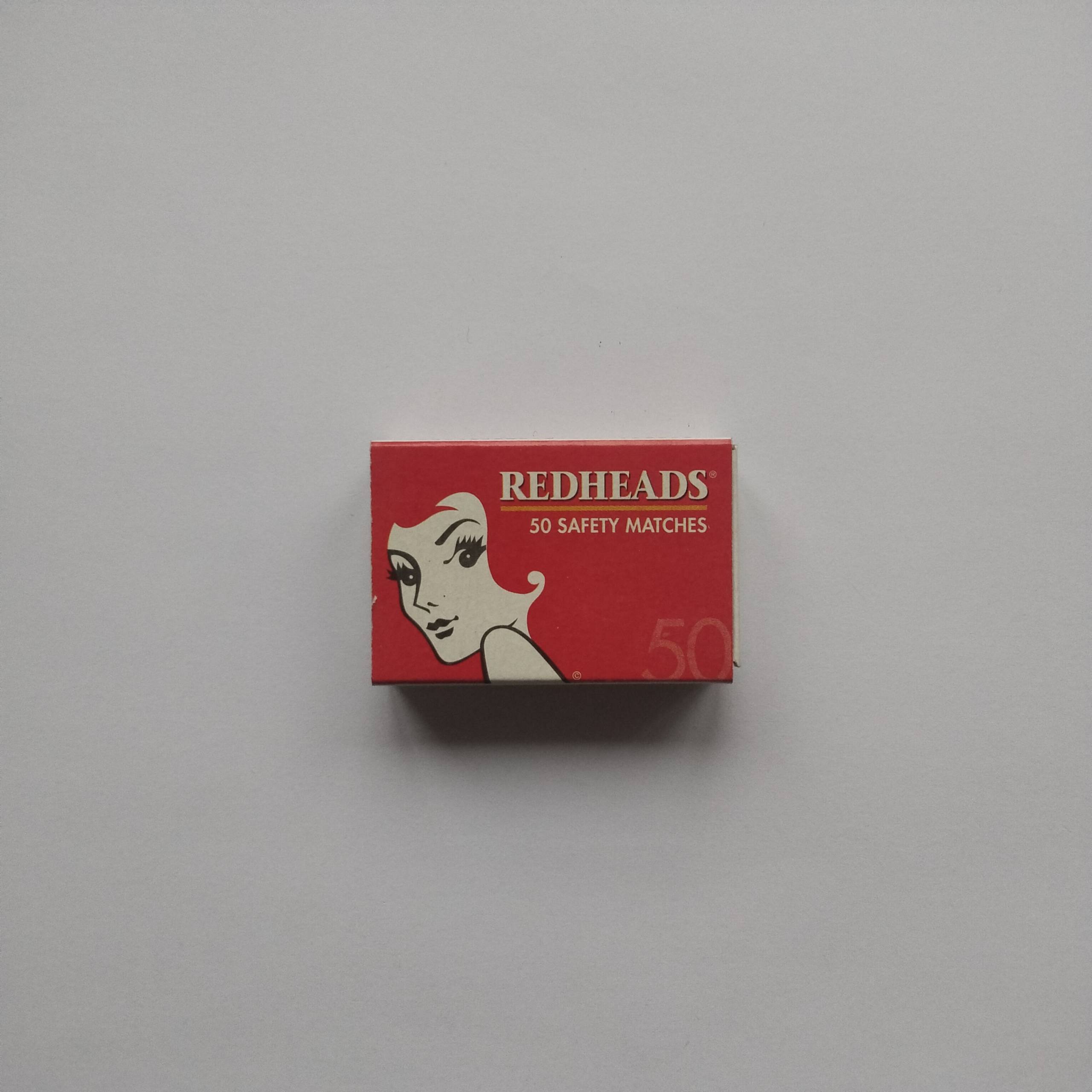 Category :Commercial BrandCountry :SwedenType :MatchboxCondition :Very goodRarity :⭐⭐⭐⭐Description :Iconic Redheads 50 Safety Matches box with stylized female illustration and Swedish production mark.ShareTwitter-xFacebookShare-emailCopy URL to clipboardChange Matchbox