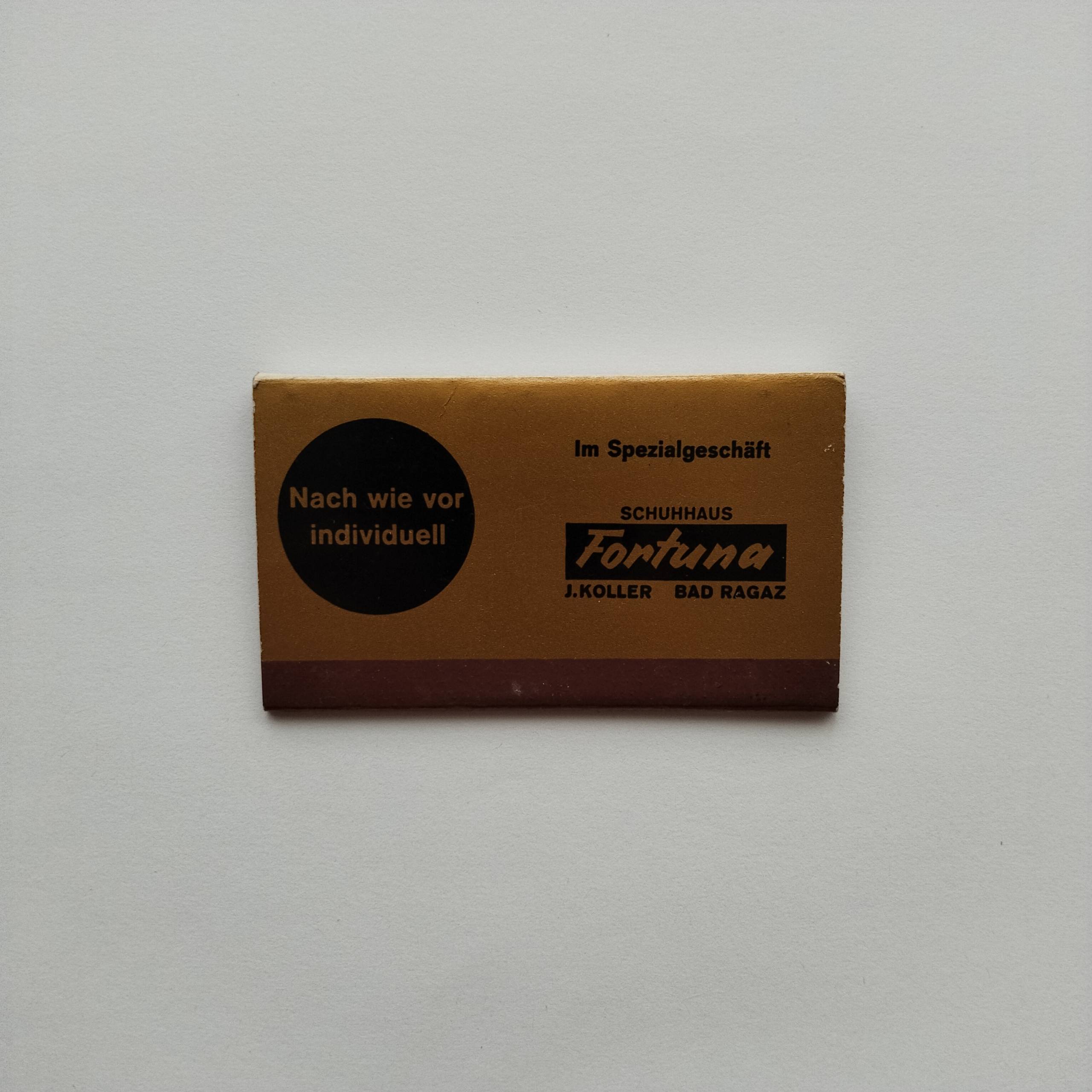 Category :Retail / Shoe Store PromotionalCountry :SwitzerlandType :Cardboard matchboxCondition :GoodRarity :⭐⭐⭐☆☆Description :“Schuhhaus Fortuna – J. Koller, Bad Ragaz” shoe store promotional matchbox; brown typographic front with slogan “Nach wie vor individuell”, reverse featuring storefront photographShare