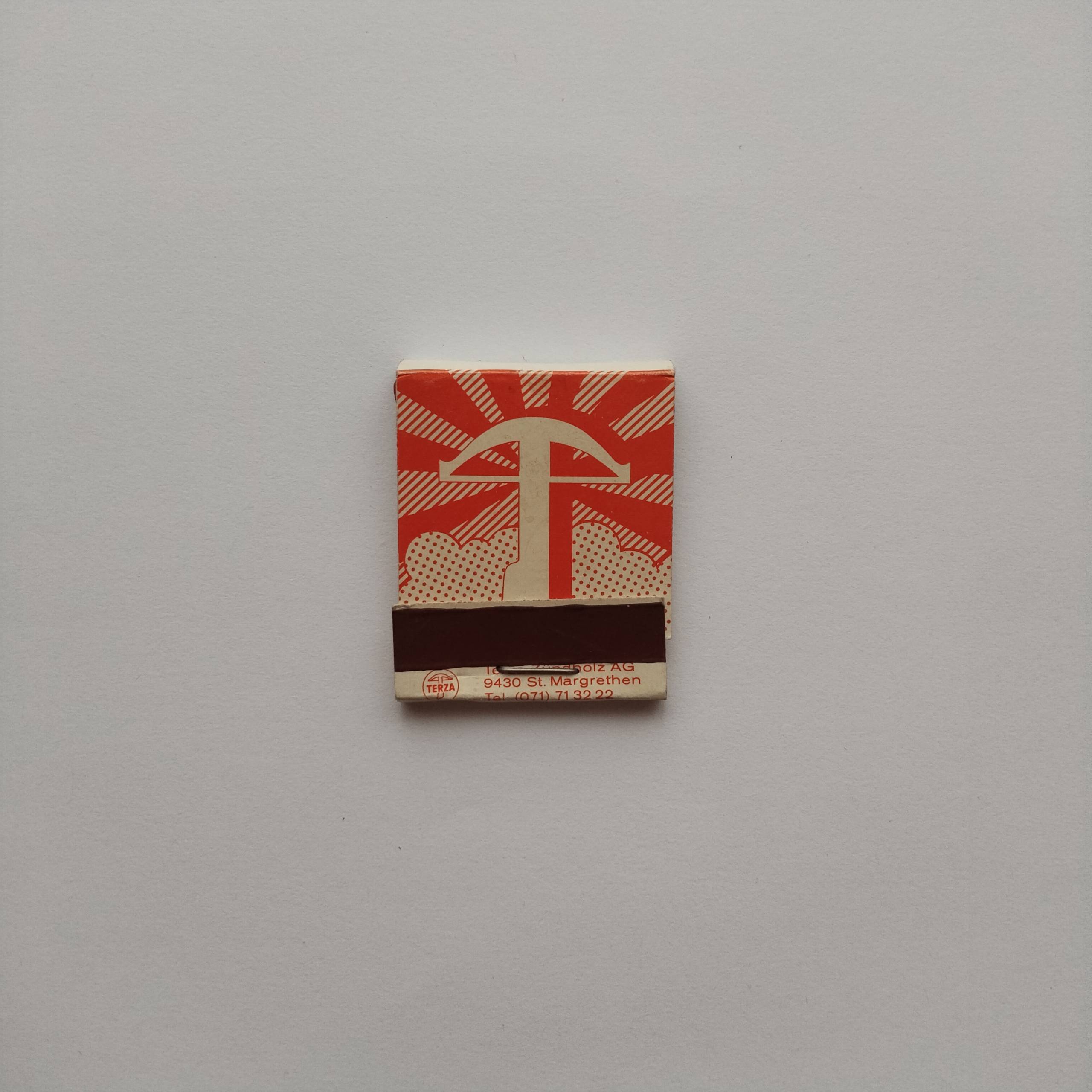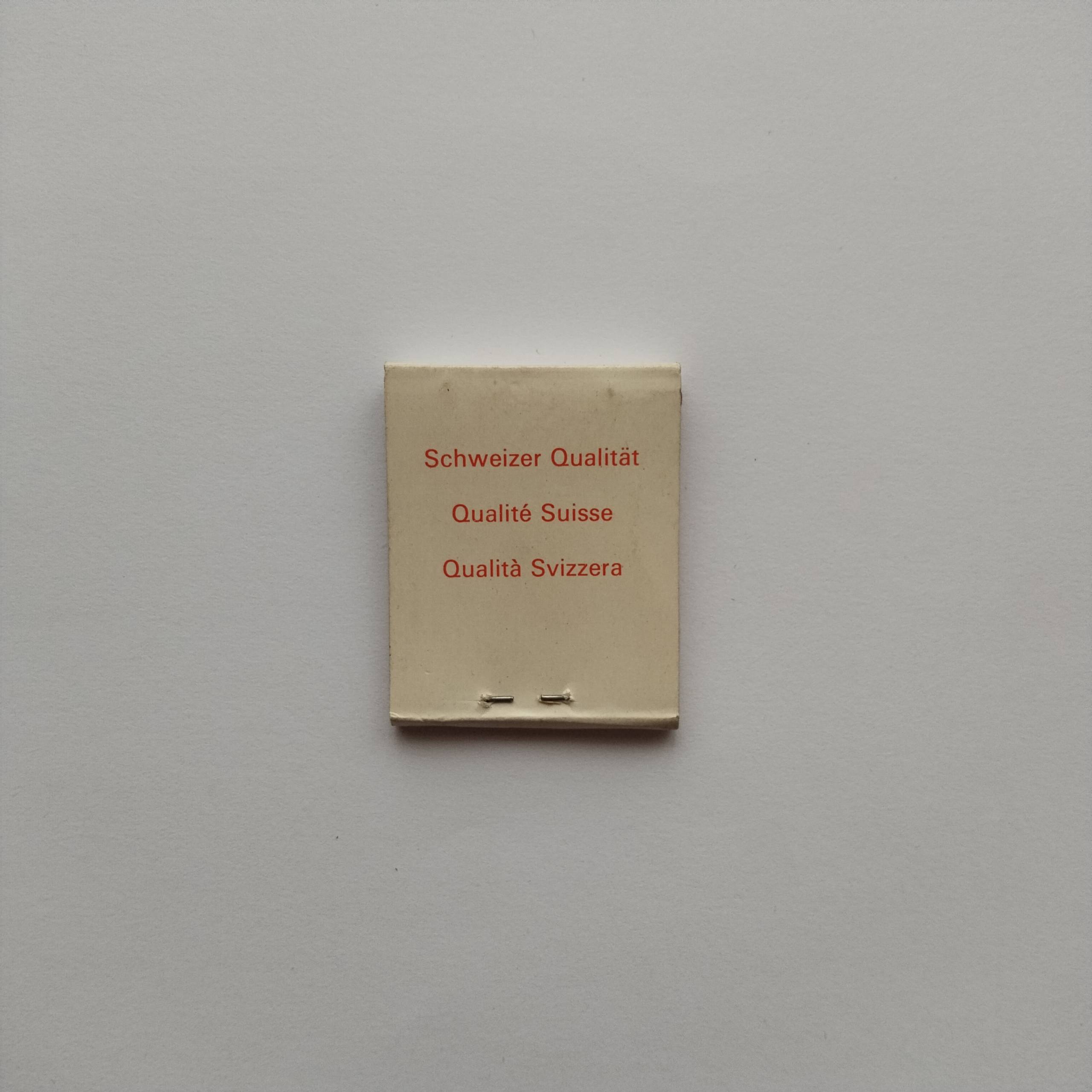 Category :Industrial / BrandCountry :SwitzerlandType :Cardboard, branded quality matchboxCondition :GoodRarity :⭐⭐⭐⭐☆Description :TERZA Swiss manufacturer matchbox with bold red graphic symbol on front and multilingual “Swiss Quality” text on back, mid-century industrial brandingShare