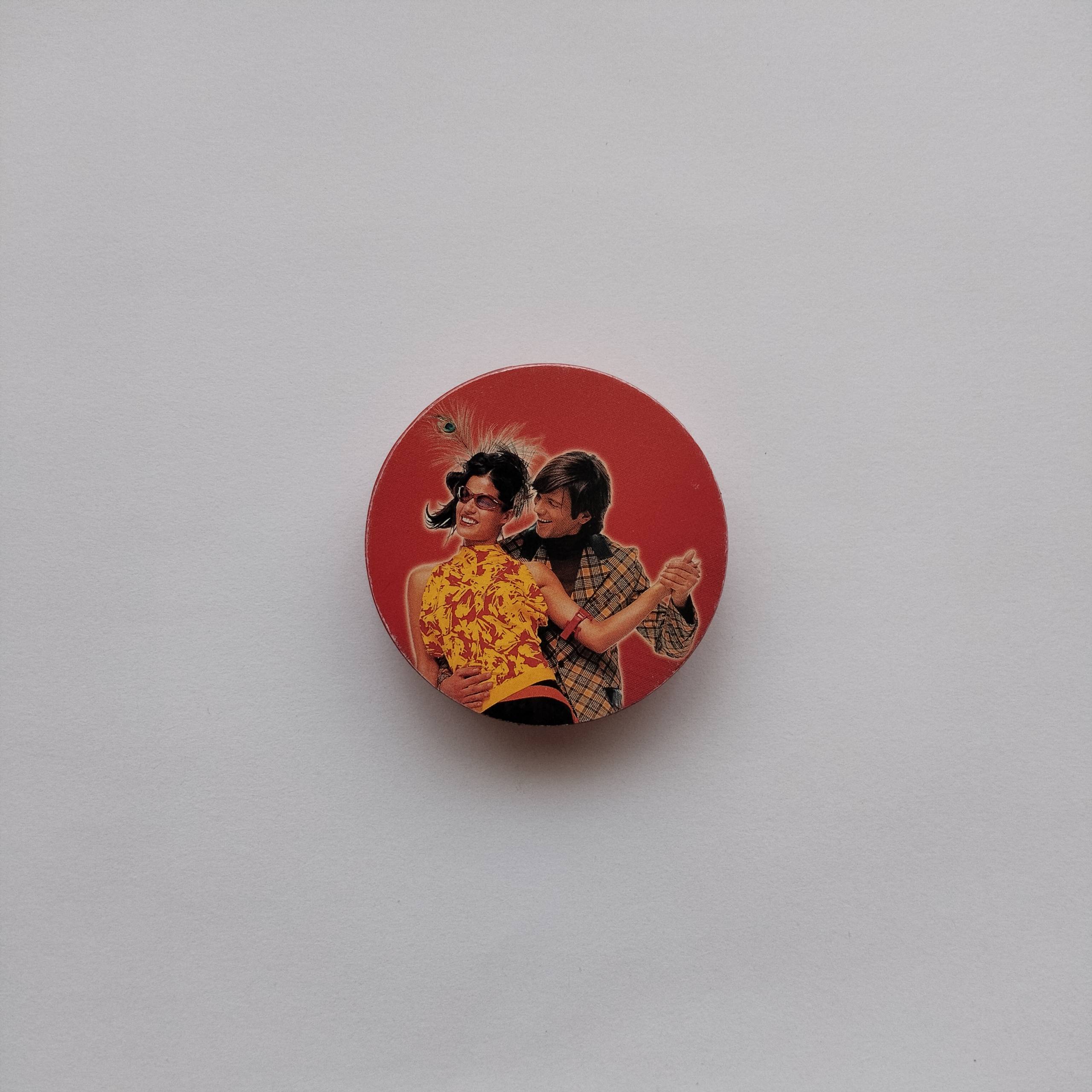Category :VintageCountry :InternationalType :Round cardboard matchboxCondition :FairRarity :⭐⭐⭐⭐☆Description :Round vintage matchbox featuring retro dancing couple illustration on red background; reverse side minimalist red with central striker circleShare